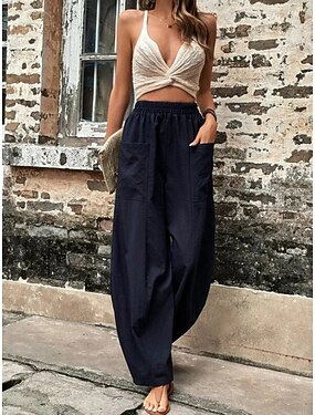 Mulheres Calças de linho de algodão Perna larga Calça casual Calça verão Férias Roupa de rua Básico Comprimento total Cintura Alta Tecido Bolsos Confortável Conforto Respirável Sem Elasticidade