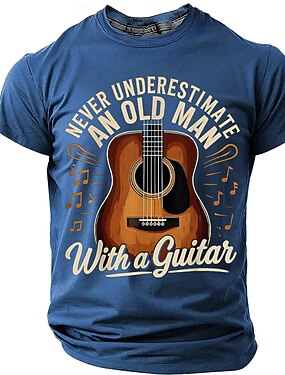 Camiseta masculina com estampa vintage retrô "Nunca subestime um velho com um violão" e notas musicais. Ideal para o Dia dos Pais. Disponível nos tamanhos P, M, G, GG, XGG e XXGG.