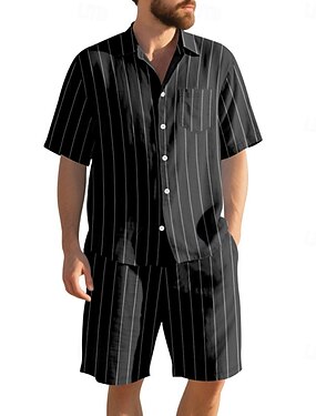 Homens Camisa de linho 2 Peças Conjunto de camisa E Calção Shorts de linho Shorts de praia Definir Listrado Diário Ao ar livre Praia Aberto para a Lateral Manga Curta Verão Moda Casual Confortável