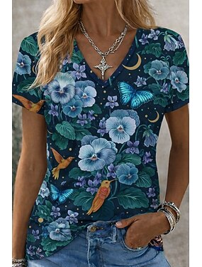 Camiseta feminina com estampa gráfica de desenho episódico, estilo vintage, clássica, manga curta, decote em V, blusa longa, ideal para uso diário, esportes e passeios, na cor azul, perfeita para