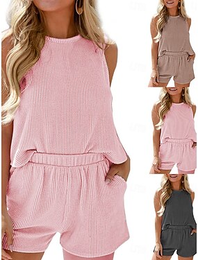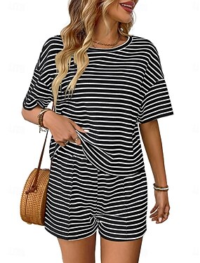 Mulheres Conjuntos de duas peças Conjuntos de shorts Manga Curta Gola Redonda Listrado Moda Roupa de rua Casual Diário Ao ar livre Preto Rosa Rosa Escuro Verão Normal