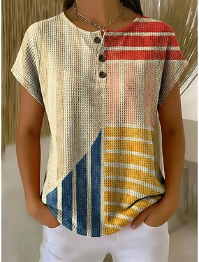 Mulheres Camiseta Imprimir Botões no peito Geométrica à moda Moderno Casual Manga Curta Henley Tops regulares Diário Cáqui Verão Primavera