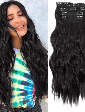 Extensões de cabelo preto de 24 polegadas com clipe, 4 peças de extensão de cabelo sintético longo e ondulado, extensões de cabelo macio com clipe, trama dupla, cabeça inteira para mulheres