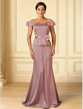 Linha A Cauda Corte Vestido de convidada de casamento Vestido formal Vestido de noite Vestido Para Mãe dos Noivos Alças Ombro a Ombro Elegante Formal Convidado do casamento Festa de Noivado Cetim com