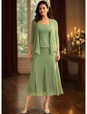 Conjuntos de vestidos de comprimento de chá vestido de convidada de casamento vestido para a mãe da noiva manga 3/4 decote quadrado elegante simples convidada de casamento com cor sólida