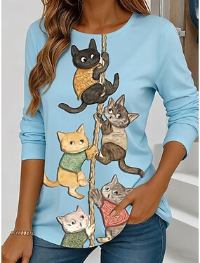 Mulheres Camiseta Imprimir Gráfico Animal Gato Moda à moda Casual Manga Longa Gola Redonda Tops regulares Diário Final de semana Azul Verão Primavera Outono