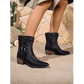Botas femininas de couro sintético preto com detalhes de borlas e estampa de crocodilo, saltos grossos para um estilo urbano