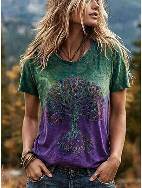 Mulheres Camiseta Imprimir Floral Gráfico Graffiti Boêmia Vintage Casual Manga Curta Decote V Tops regulares Diário Azul Verão Primavera