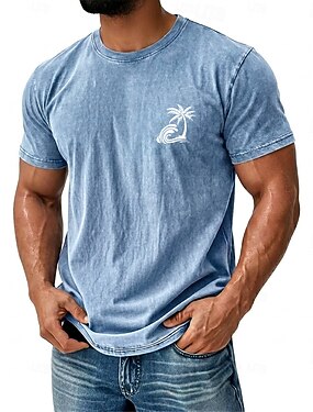 Camiseta masculina vintage azul com estampa de ondas do oceano e palmeiras, gola redonda, manga curta, ideal para surfe, praia e férias. Presente perfeito para ele, roupa de grife.