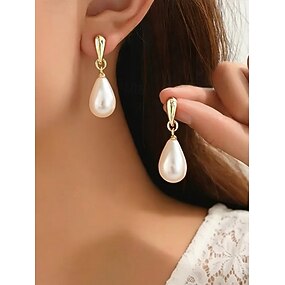 Brincos femininos em formato de gota com pérolas artificiais – disponíveis em dourado e prateado, com design elegante para casamentos, eventos noturnos e uso diário.