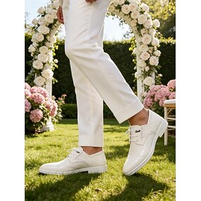 Sapatos sociais masculinos brancos em couro sintético, calçado formal clássico com acabamento polido, perfeitos para casamentos e eventos especiais.
