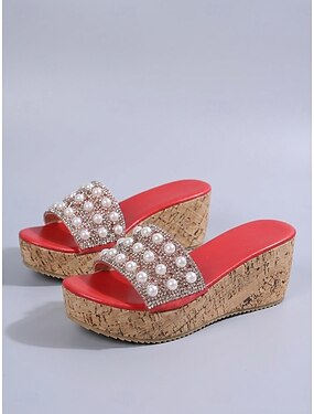sandálias femininas de cunha com strass e pérolas falsas, com design de tira em T, sola confortável e estilo casual de verão para uso ao ar livre e em festas