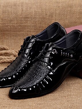 Sapatos Oxford masculinos em couro sintético marrom envernizado – elegantes e sofisticados, com textura de crocodilo, ideais para casamentos e eventos formais.