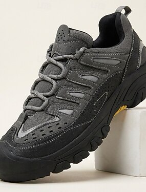 Tênis masculino cinza para caminhadas ao ar livre, com cadarço, respirável e com amortecimento. Calçado esportivo resistente e casual para viagens, trekking, camping, trabalho ao ar livre e uso diário.