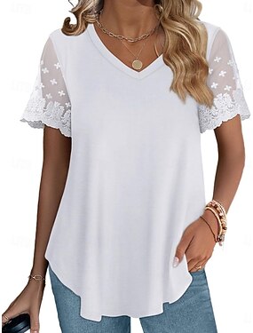 Mulheres Camiseta Top de emenda de renda T-shirt Côr Sólida Moda Clássico Casual Manga Curta Decote V Tops regulares Diário Para Noite Final de semana Azul Branco Verão Primavera