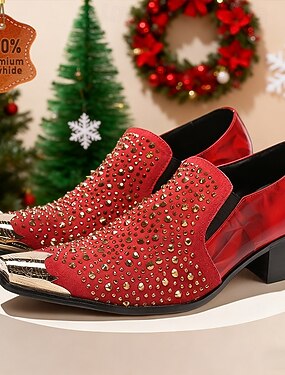 mocassins masculinos de couro legítimo vermelho com detalhes cravejados – calçados glamorosos para as comemorações de Natal e Ano Novo