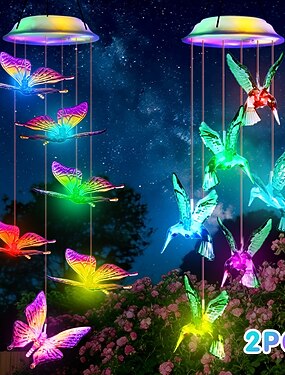 beija-flor &Conjunto de 2 sinos de vento solares à prova d'água em formato de borboleta para jardim, pátio, varanda, quintal, casa de campo, decoração de verão e aniversários. Ideal para decoração de