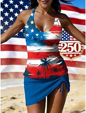 Dia da Independência Aniversário Americano Patriótico Moda Praia Feminina Tankini Saia Elegante Férias Estampa Gráfica Bandeira Alça Decotada Sem Mangas Trajes de Banho