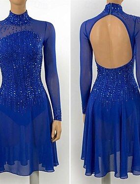 Vestidos para Patinação Artística Mulheres Patinação no Gelo Vestidos Azul Patchwork Sem costas Com Stretch Treino Competição Roupa para Patinação Clássico Cristal / Strass Manga Longa Patinação no
