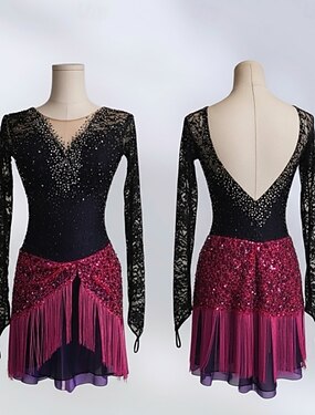 vestido preto para dança de salão feminino com detalhes de franjas de strass, mangas compridas e decote em V – ideal para dança latina, tango e performance