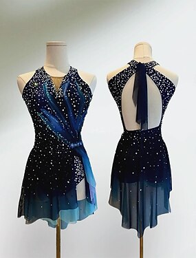Vestido de patinação artística para mulheres, vestido de patinação no gelo para meninas, azul marinho, costas abertas, bainha assimétrica, malha de alta elasticidade, roupa de competição para