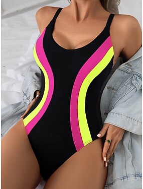 Maiô Feminino de Uma Peça Efeito Emagrecido Efeito Plissado Colorblock Monokini Corte Alto Controle de Barriga Cintura Alta Slim Costas Nua Roupas de Praia para Férias Gráfico Vintage Decote em V Sem