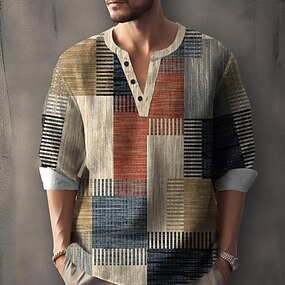 Homens Bloco de cor Estampa Geométrica Camisa Social camisa de botão Camisa Henley Manga Longa Vintage Casual Diário Feriado Verão Primavera Outono Sem Colarinho Decote V Imprimir Vermelho Azul Roxo