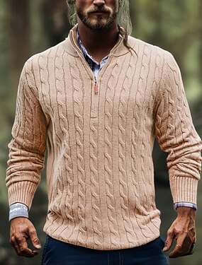Homens Pulôver suéter Suéteres com zíper Suéter de malha Estriado Tricotar Tops regulares Tricotado Tecido Meio Zíper Moda Casual Férias Roupa Diária Roupa Outono Inverno Camelo Preto S M L