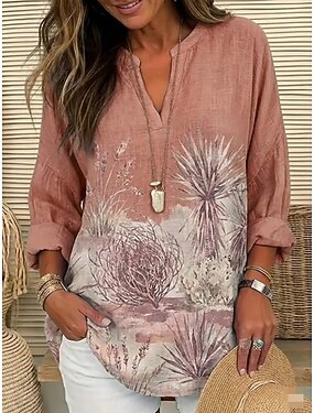 Mulheres Camisa Social Túnica Imprimir Gráfico Flor Vintage Diário à moda Manga Longa Decote V Tops regulares Diário Feriado Rosa Verão Primavera