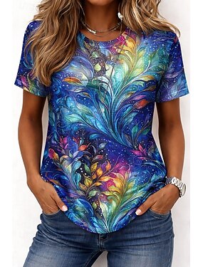 Mulheres Camiseta Imprimir Floral Gráfico Cores Gradiente à moda Clássico Casual Manga Curta Gola Redonda Decote Redondo Tops longos Casual Diário Azul Laranja Verão Primavera Outono