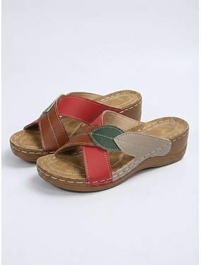 sandálias femininas multicoloridas com patchwork de folhas - chinelos confortáveis de cunha com bico aberto para uso casual e ao ar livre