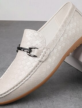 Mocassins masculinos brancos com textura de crocodilo, modelo slip-on, casuais e elegantes, com detalhe metálico, ideais para casamentos, festas em resorts, eventos em iates, looks business casual e casuais de verão.