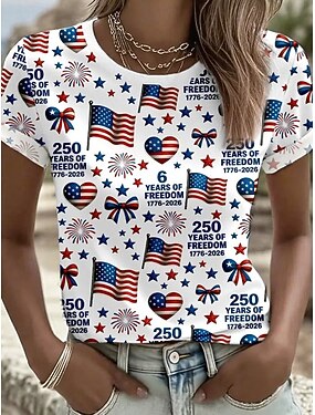 Dia da Independência Americana Mulheres Camiseta T-shirt Imprimir Gráfico à moda Clássico Casual Manga Curta Gola Redonda Tops regulares Diário Esportes Para Noite Azul Verão Primavera 250th