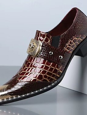Mocassins masculinos bordô com fivela de fivela, em couro brilhante, sapatos sociais formais sem cadarço para casamentos, negócios, noivos, escritório, banquetes, festas, eventos noturnos, estilo elegante e formal.