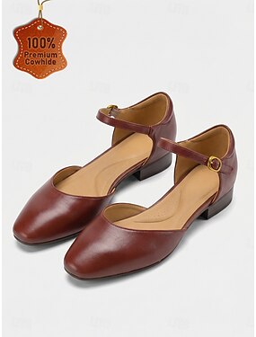 Sapatos Mary Jane vintage femininos dos anos 50, em couro sintético marrom com fivela e detalhes brogue – scarpins elegantes para ocasiões formais, escritório e uso do dia à noite.