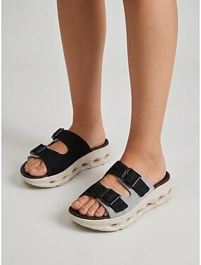 Sandálias femininas pretas de dedo com fivela dupla – sandálias esportivas respiráveis com suporte para o arco do pé, confortáveis e casuais, perfeitas para o verão e viagens. &roupa para uso diário