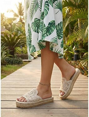 Sandálias plataforma femininas boho bege em crochê - sandálias espadrille confortáveis em tecido trançado com bordado vazado, ideais para resorts ao ar livre e jardins tropicais. &escapadelas de verão