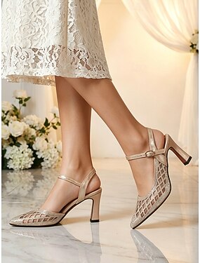 Sapatos de salto bloco champanhe para mulheres – elegantes sapatos de bico fino com tira no calcanhar, ideais para a mãe da noiva em casamentos na cidade. &eventos formais
