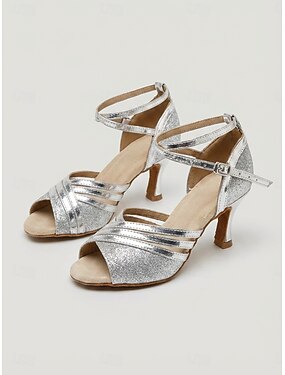 Sapatos de dança latina femininos prateados com glitter - sapatos clássicos de dança de salão e salsa com tiras