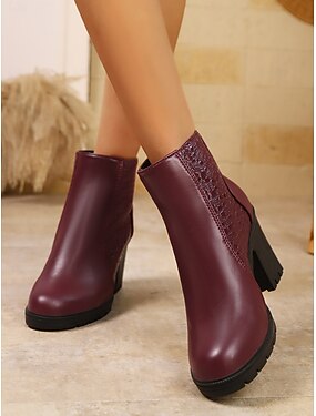 Botas femininas de salto grosso cor de vinho – botas elegantes de plataforma em couro sintético para uso casual no outono e inverno e para o escritório