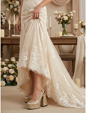 Sapatilhas de dama de honra cor champanhe para mulheres - sapatos elegantes de salto baixo com detalhes florais para casamentos no jardim.