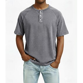 Homens Camisetas Top Henley Camiseta de algodão Camisa lavada Manga Curta Côr Sólida Tecido Cor Única Vintage Designer Casual Tingimento em peça Desaparecido Botões Gola Redonda Henley Casual Diário