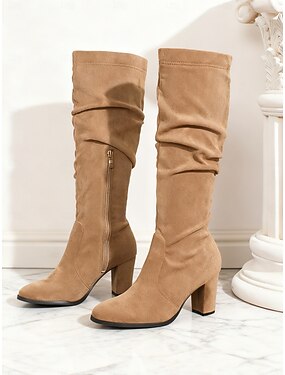Botas femininas de camurça marrom até o joelho, com salto bloco grosso e detalhe de zíper. Estilosas e confortáveis para uso diário, no inverno e em qualquer ocasião.