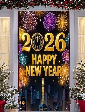 Ano Novo Pôsteres Tampa da porta Banners externos feliz Ano Novo 2026 Estilo bonito 3D De Festa Dorm Sala de Adolescentes Dormitório da faculdade Quarto de fraternidade da caverna masculina Fundos de
