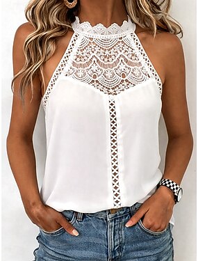 Mulheres Malha Íntima Renda Patchwork Tecido Moda à moda Clássico Manga Curta Halter pescoço Tops regulares Diário Para Noite Final de semana Branco Verão Primavera
