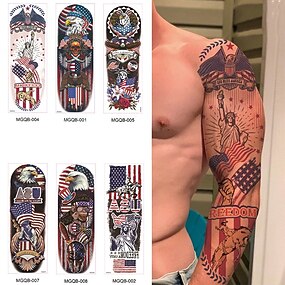 8 folhas de tatuagens temporárias para braço inteiro, com desenhos patrióticos da bandeira dos EUA, águia e caveira, tatuagens falsas extragrandes à prova d'água para decoração de festas do Dia da