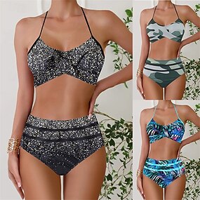 Maiô Feminino Biquíni 2 Peças Alta Cintura Costas Nuas Roupas de Praia Floral Gráfico V Decote Sem Mangas