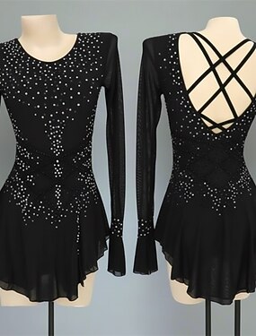 Vestidos para Patinação Artística Mulheres Para Meninas Patinação no Gelo Vestidos Preto Patchwork Sem costas Com Transparência Elasticidade Alta Treino Competição Roupa para Patinação Clássico Manga