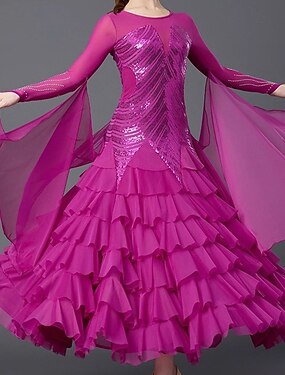 Dança de Salão Vestido Pedrarias Pregas Recortes Mulheres Festa Treino Espetáculo Manga Longa Alto Elastano Poliéster