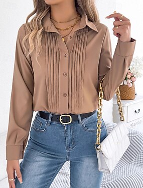 Mulheres Blusa Tops elegantes Franzido Patchwork Botões Côr Sólida Tecido Elegante Vintage senhoras Manga Longa Colarinho de Camisa Tops regulares Diário Trabalho Feriado Preto Branco Vermelho Roxo